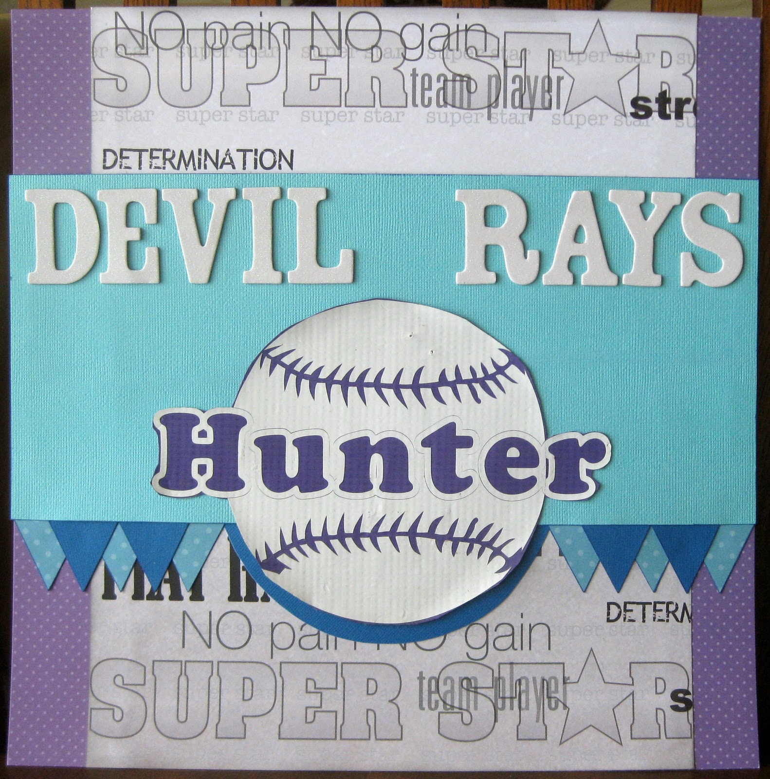 Based on this sketch at If It's Groovy. I loved this sketch! I had already done my son's "sports" book in 8x8, even bought an extra book so I could add more later...unfortunately, in high school the pictures are 8x10!!!! Oh well, it was one of my first books, so I don't mind re-doing this one ;) That being said, this is my now 15 year old when he was 5 and playing T-Ball--a league away from the Little League World Series champs LOL! We live in the same city, but there are at least 3 leagues here that I know of, we still rooted for them and are very proud that they are from Huntington Beach :) I used the colors of his team, with the blue cardstock and purple dot paper. The sports words paper is from Paper House Productions. I wanted to add a little something something, so I went through my scraps, and used my Fiskars triangle punch to make a little pennant banner.